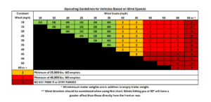 As the chart above shows, trucks that aren’t hauling much weight or trucks with empty trailers are much more vulnerable to high winds. They are more likely to tip over if a strong gust of wind catches the trailer.