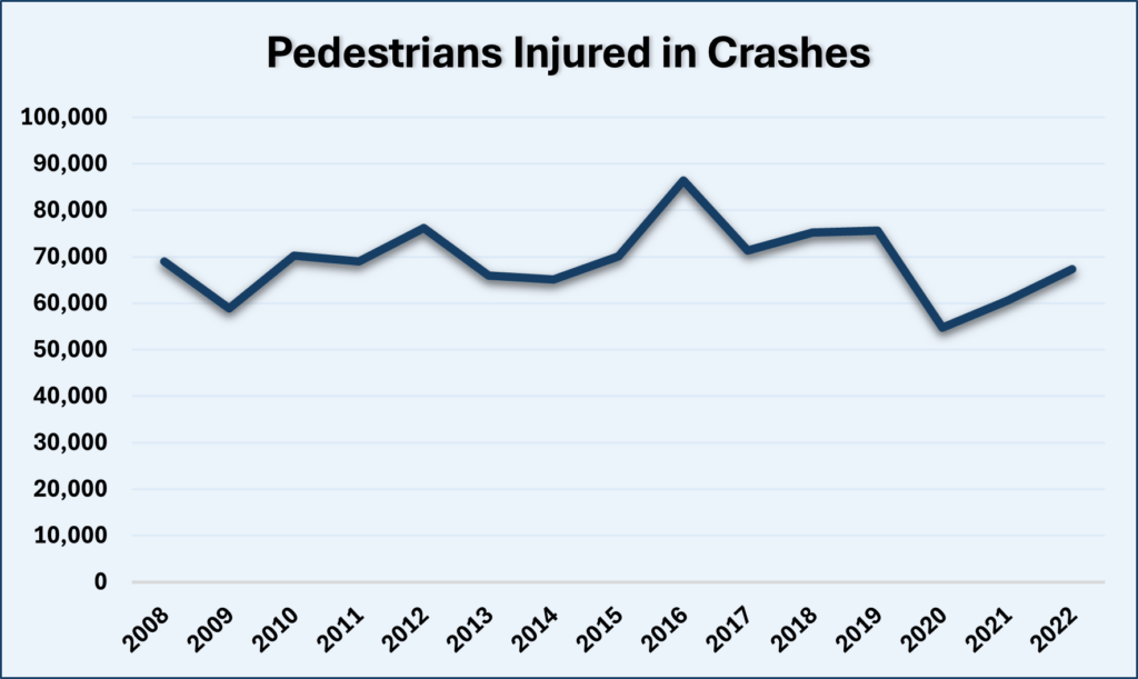 In 2022, the most recent year with data available, more than 67,000 pedestrians were injured and more than 7,500 were killed in collisions in the United States. For both pedestrian injuries and deaths, the percentage of hit and runs was 25%.